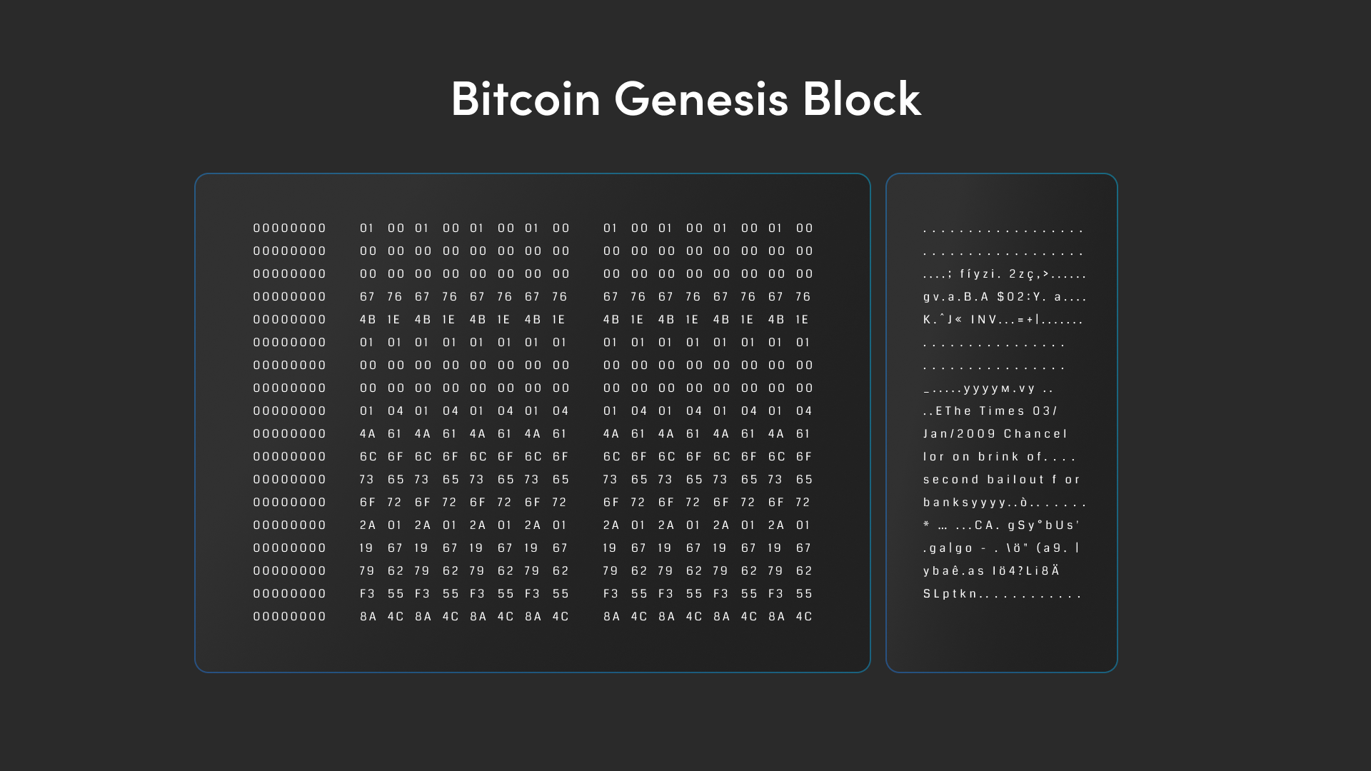 Example: Bitcoin introduced the concept of embedding messages within transaction outputs. Satoshi Nakamoto's message in the Genesis Block: