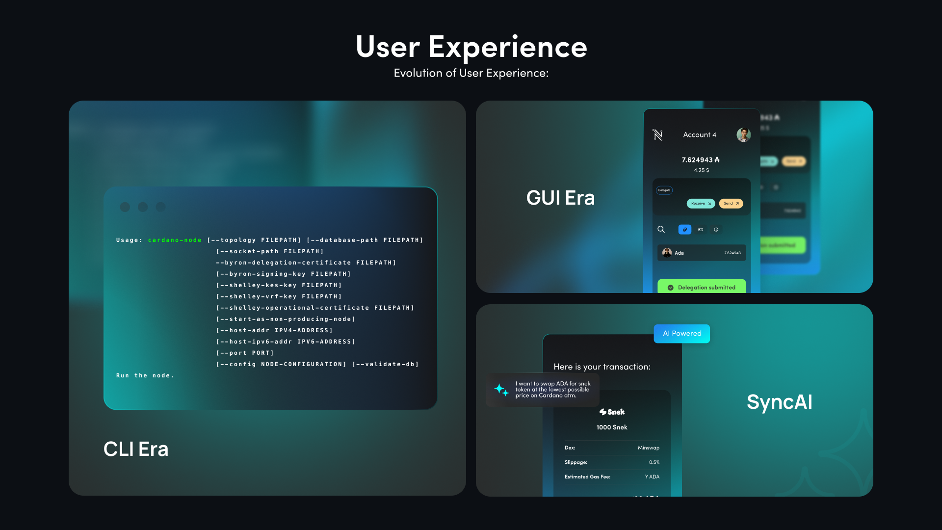 * The current era is marked by the integration of natural language processing (NLP) and artificial intelligence (AI) to further simplify user interactions with Web3 applications. However, platforms like Cardano are still catching up in leveraging these advancements. AI-powered interfaces can make Web3 interactions as seamless as conversing with a digital assistant. This evolution promises to make blockchain technology accessible to a wider audience by abstracting technical complexities even further.